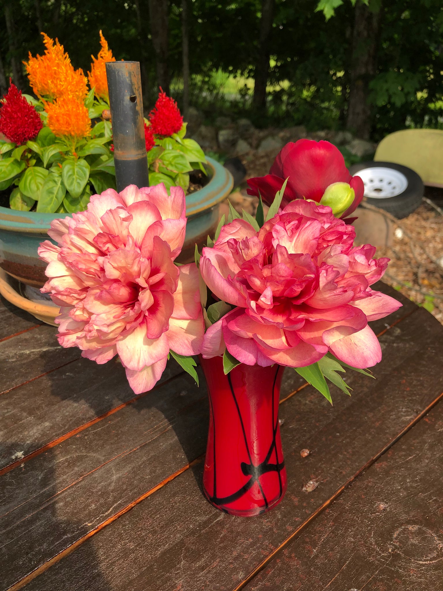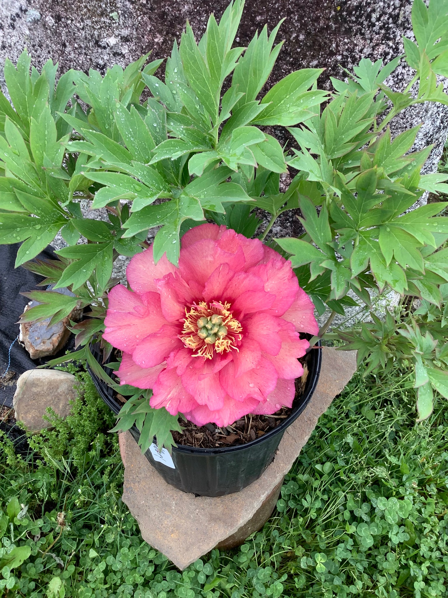 Shades of rich rose-pink blend beautifully in the impressively large, semi-double blossoms of Itoh Peony 'Hillary.' Merlot-red flares at the petal bases accentuate the radiance of the contrasting yellow stamens, and the centers keep their color as the blossoms age to cream with picotee edging. The subtly fragrant flowers are held aloft on an upright shrub with semi-glossy foliage. Mature plants are covered all over with blooms. Winner of the American Peony Society’s Award of Landscape Merit.